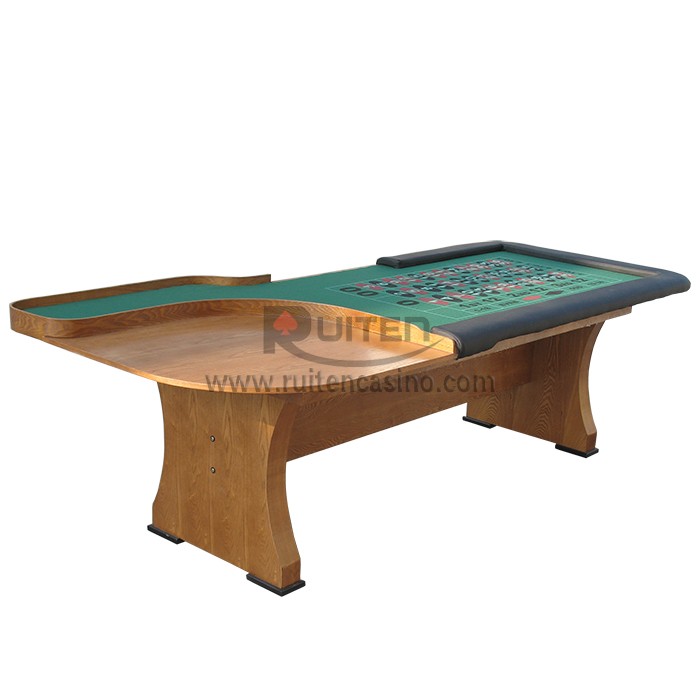 This high-quality casino roulette table is a huge 8 feet long! Surrounding most of the table is a removable, black vinyl padded armrest for the comfort of your guests. top quality 100% wool felt with original casino layout,  Legs are oak wood finished. don't including the roulette wheel and accessoryies.