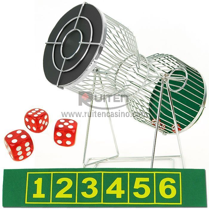 This is chromed metal dice cage,with 3pc dice and a layout. two size is avaliable ,one is 9" and the other is 18".
