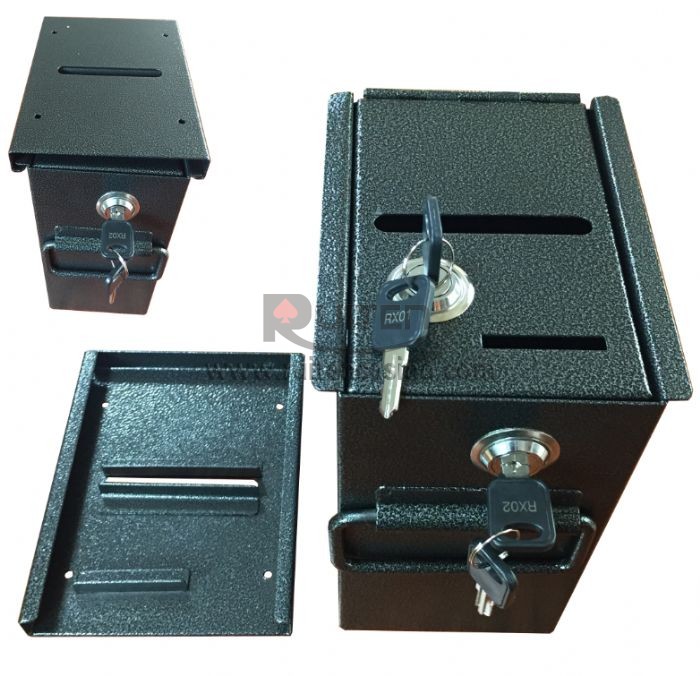 This is small tip box for casino, measureing 4inch width,6inch deepth and 8.5inch high,with the shell screwed to black of table and drop box slided to the sheel ,one locked to table,and the other locked the box. good for casino